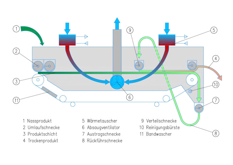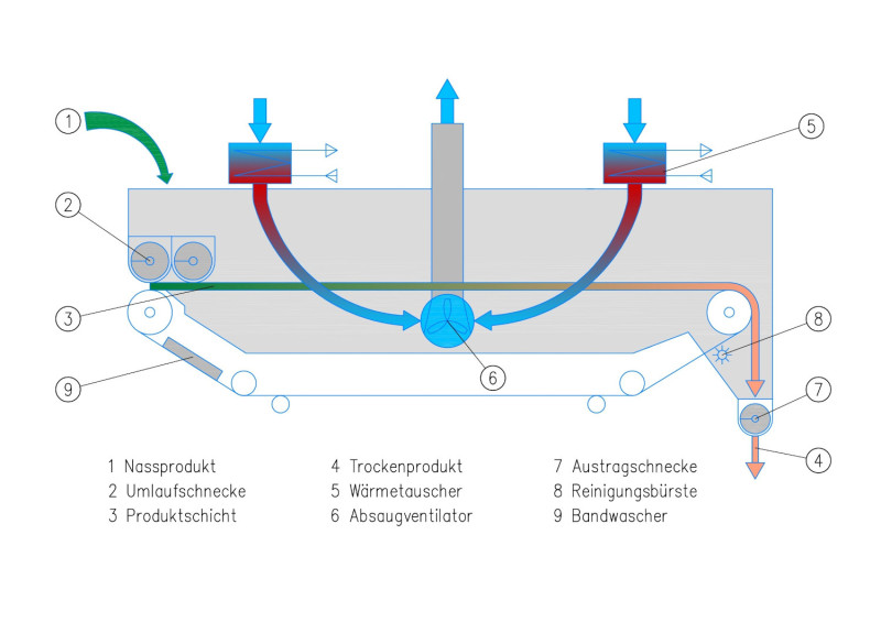 Je nachdem, wie hoch der Wassergehalt des getrockneten Produktes sein soll, kommt ein Einschicht- oder ein Zweischicht-Bandtrockner zum Einsatz. Wenn der Wassergehalt des Produktes nach der Trocknung mehr als 20% betragen soll, eignet sich ein Einschicht-Bandtrockner. Soll die Restfeuchte unter 20% liegen, ist ein Zweischicht-Trockner ideal.