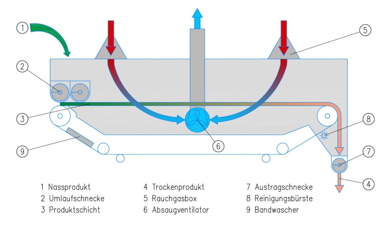 Der SWISS COMBI KUVO ist ein Bandtrockner, der speziell für die Verwertung von heisser Prozessluft oder Rauchgas aus einem Trommeltrockner oder Boiler konzipiert wurde. Die Prozessluft oder das Rauchgas wird heruntergekühlt und dann durch die Produktschicht im KUVO geführt. Die Produktschicht dient so als Staubfilter und wird gleichzeitig vorgetrocknet.