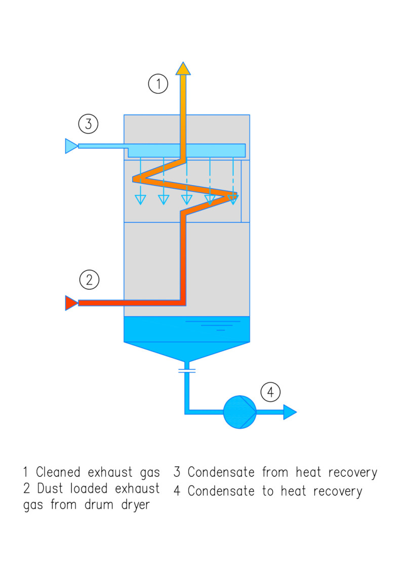 The SWISS COMBI condenser is used for energy recovery from drum dryer vapors. It can be used with both directly and indirectly heated drum dryers (SWISS COMBI ecoDry).