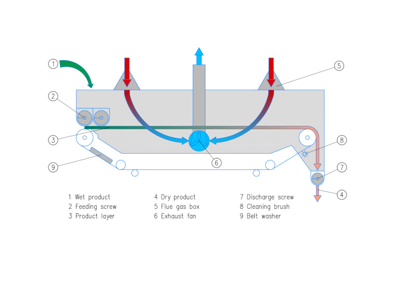 The SWISS COMBI KUVO is a belt dryer specially designed for the utilisation of hot process air or flue gas from a drum dryer or boiler. The process air or flue gas is cooled down and then passed through the product layer in the KUVO. The product layer thus serves as a dust filter and is pre-dried at the same time.